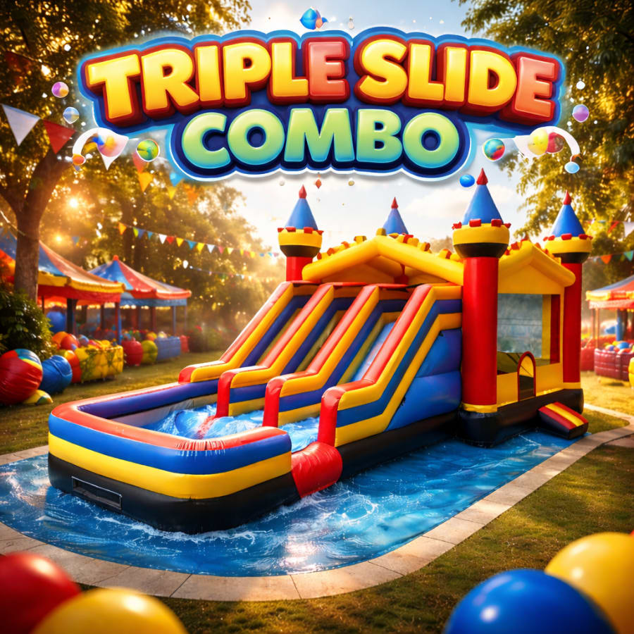 Find Bounce house rentals Triple Lane Combo Bounce House in Broward, Miami-Dade and Palm Beach County. This triple lane combo delivers nonstop excitement for kids and adults. Perfect for backyard party, bbq, corporate events, and birthday celebrations. Bright colors. Fast slides. Safe bounce zones. 🎈