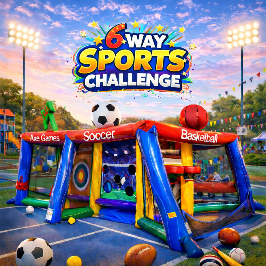 Looking for an interactive inflatable that everyone will love? Our Ultimate All-Star Sports Challenge is a 6-in-1 inflatable sports game featuring basketball, football, soccer, baseball, archery, and more. Perfect for birthday parties, school events, field days, church events, corporate events, and festivals. This multi-sport inflatable keeps kids, teens, and adults entertained with friendly competition and nonstop fun. Clean, safe, and professionally delivered — book your inflatable sports challenge today!