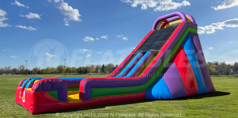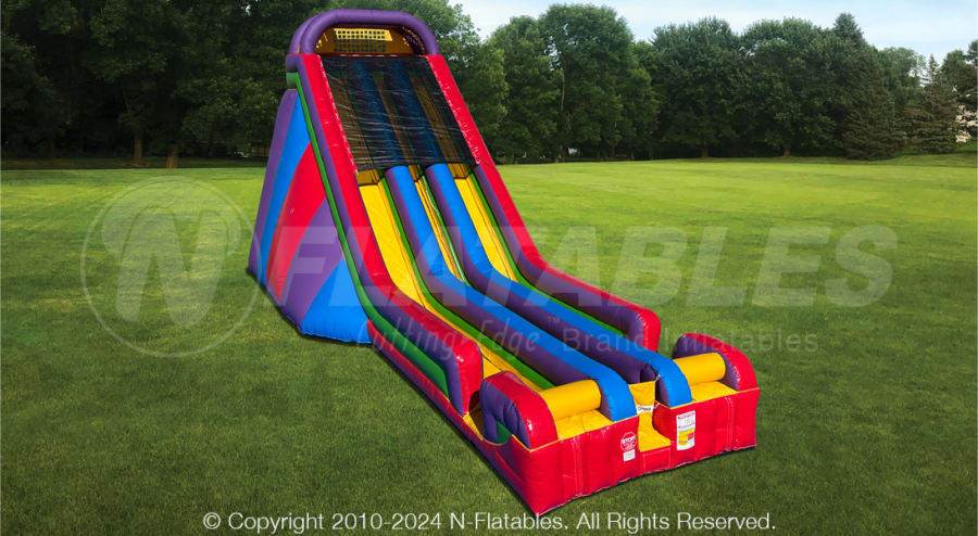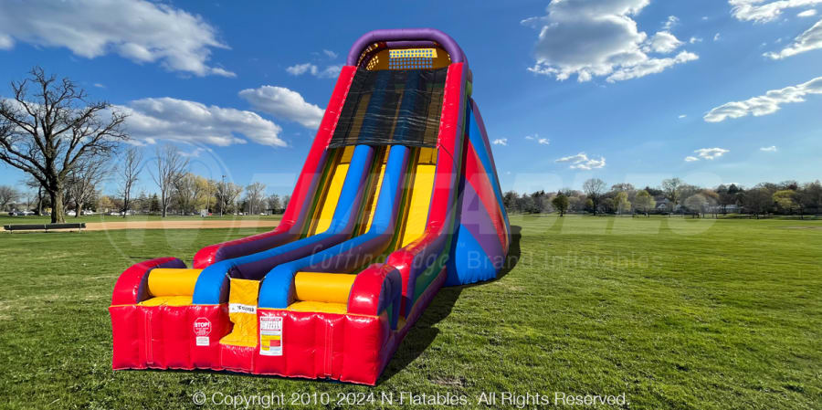 Standing an impressive 28 feet tall, the Wacky Dual Lane Slide delivers double the excitement with its dual lanes, allowing two participants to race side by side. Designed for both wet and dry use, this slide is ready for action all year round—enjoy it as a refreshing water slide on hot summer days or a fast-paced dry slide during cooler months. Its bold, colorful design instantly attracts attention and keeps the energy high at your event.