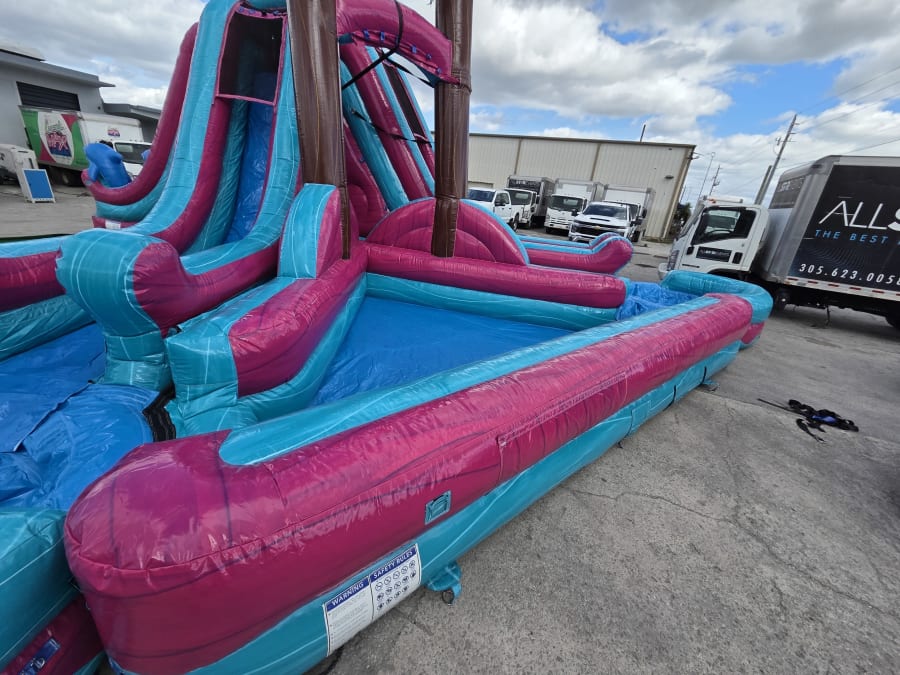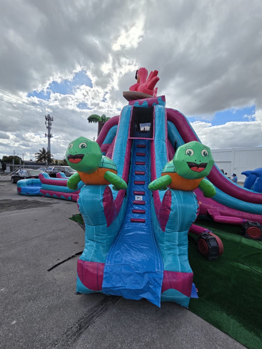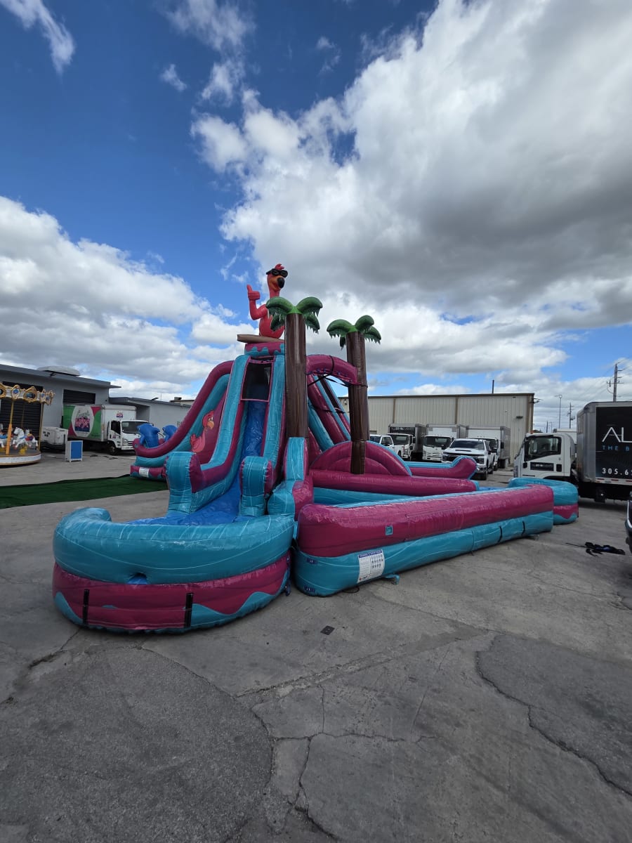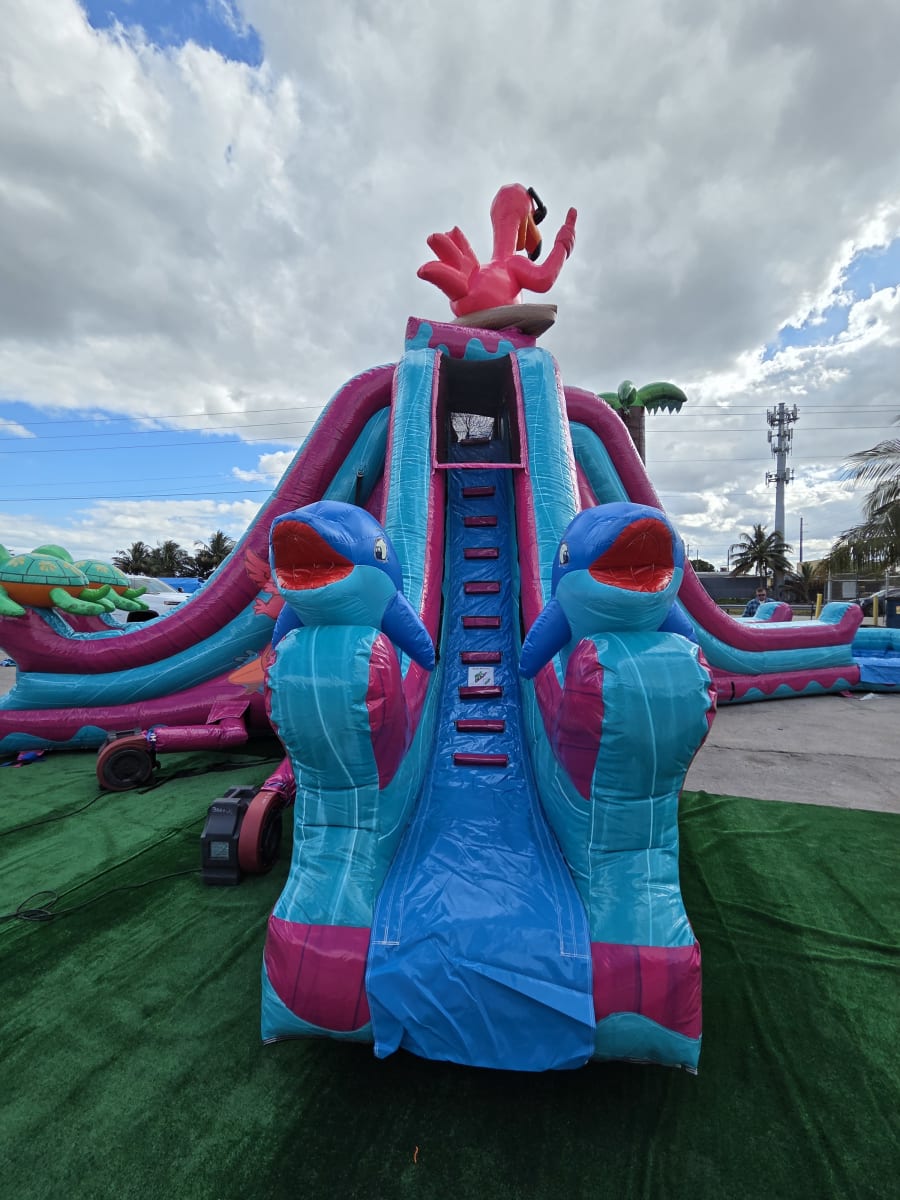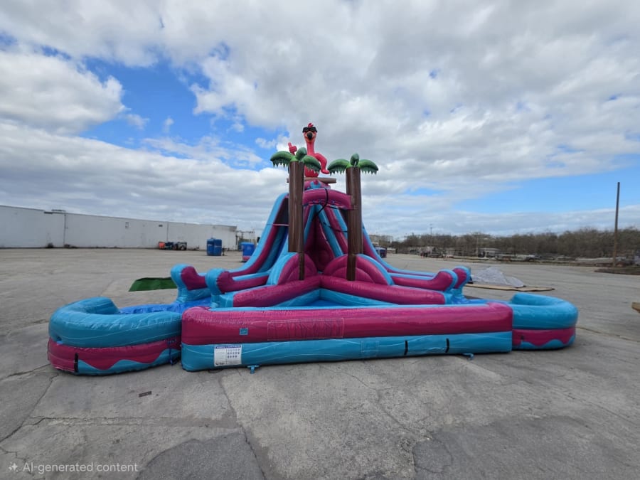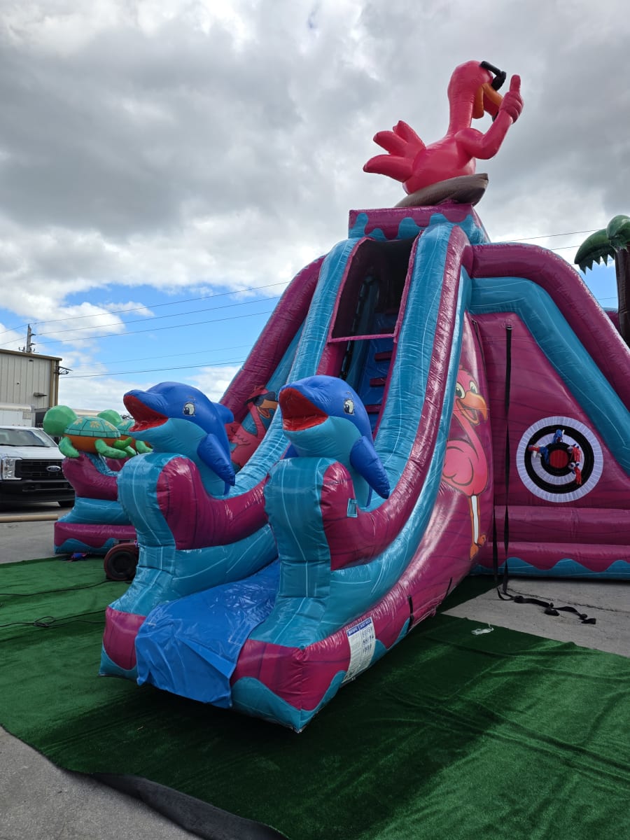 The Flamingo Xtreme Special Dual Lane Slide is a show-stopping 22 ft inflatable that turns any event into a carnival. Fast lanes. Bright flamingo styling. Safe engineering. Perfect for birthdays, fairs, church events, and backyard parties. This slide delivers high-energy entertainment and repeat smiles for guests of all ages.